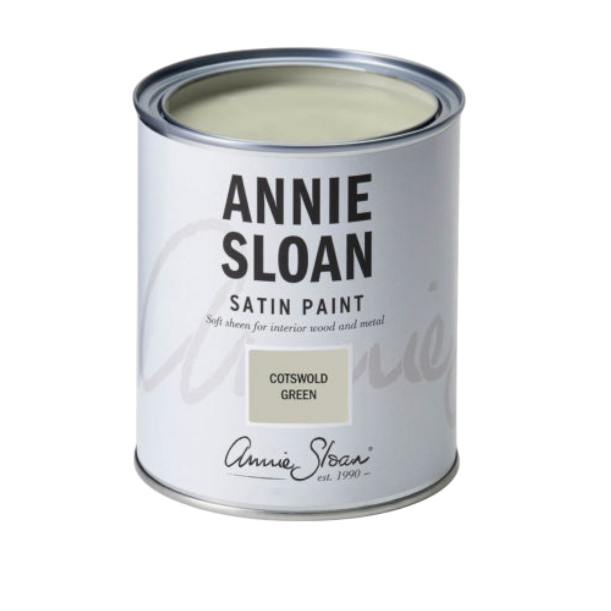 Annie Sloan satin paint in Cotswold Green is a beautiful sage green inspired by the typical exterior paint color of this picturesque rural area of the UK. It works superbly as a versatile, flattering, and complex green, pairing beautifully with organic materials such as stone, slate, and rattan.
