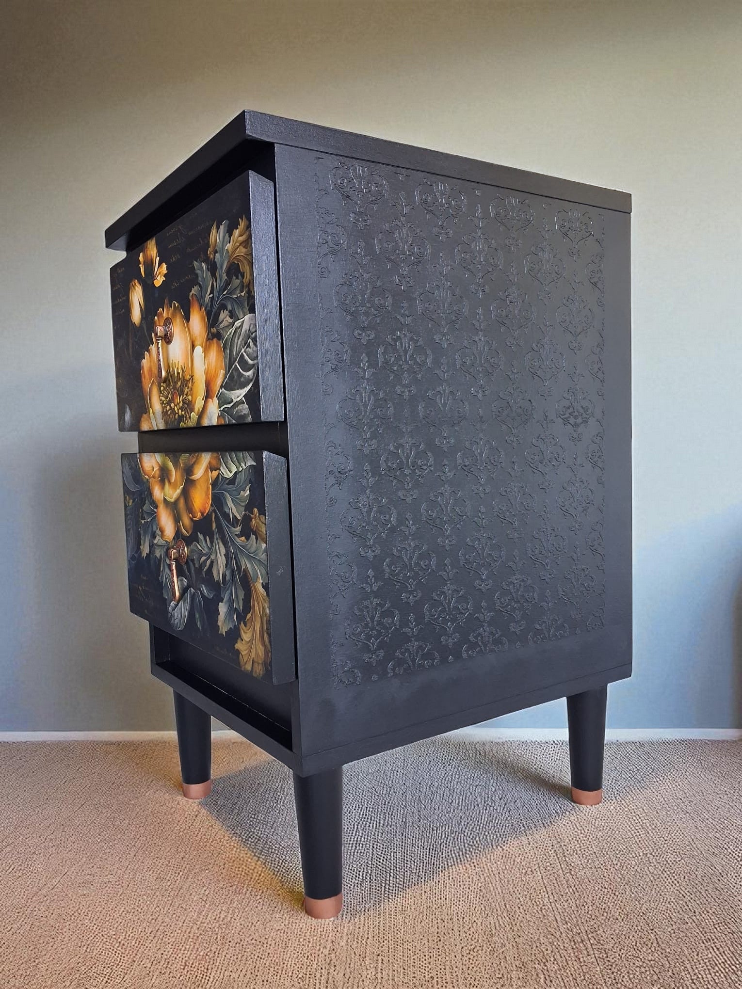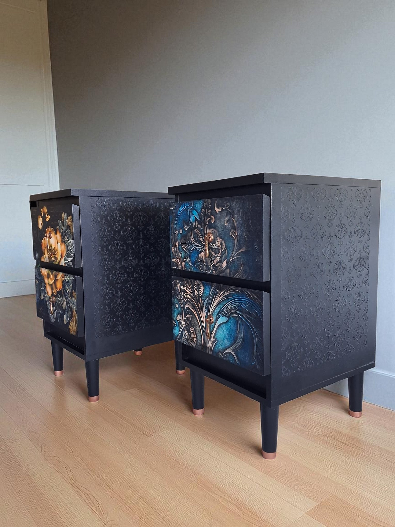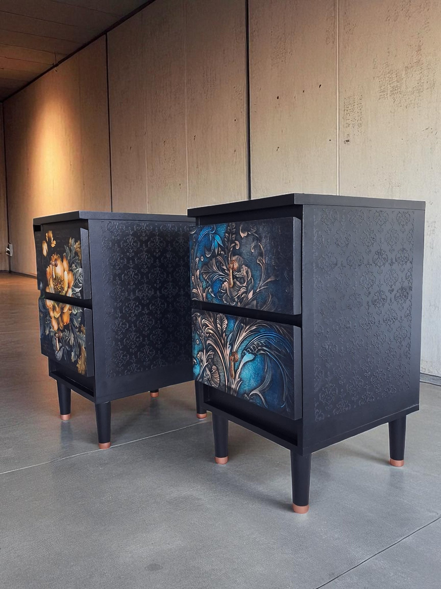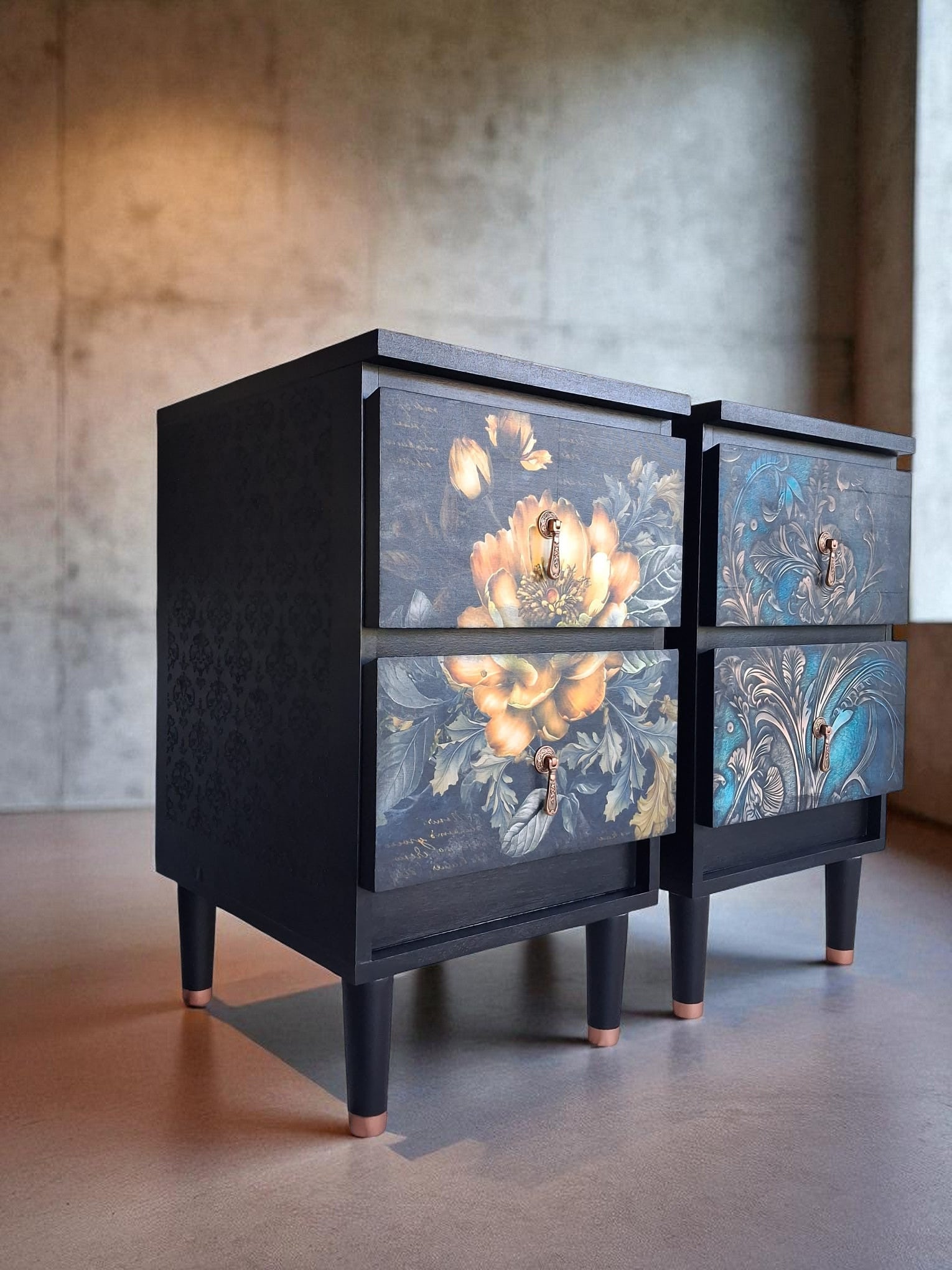 Pintadas a mano en negro mate con elegantes frentes en decoupage floral, detalles en esténcil damasco en los laterales y patas estilizadas con puntas en color cobre. Acabadas con tiradores dorados vintage que aportan un toque artístico y atemporal.