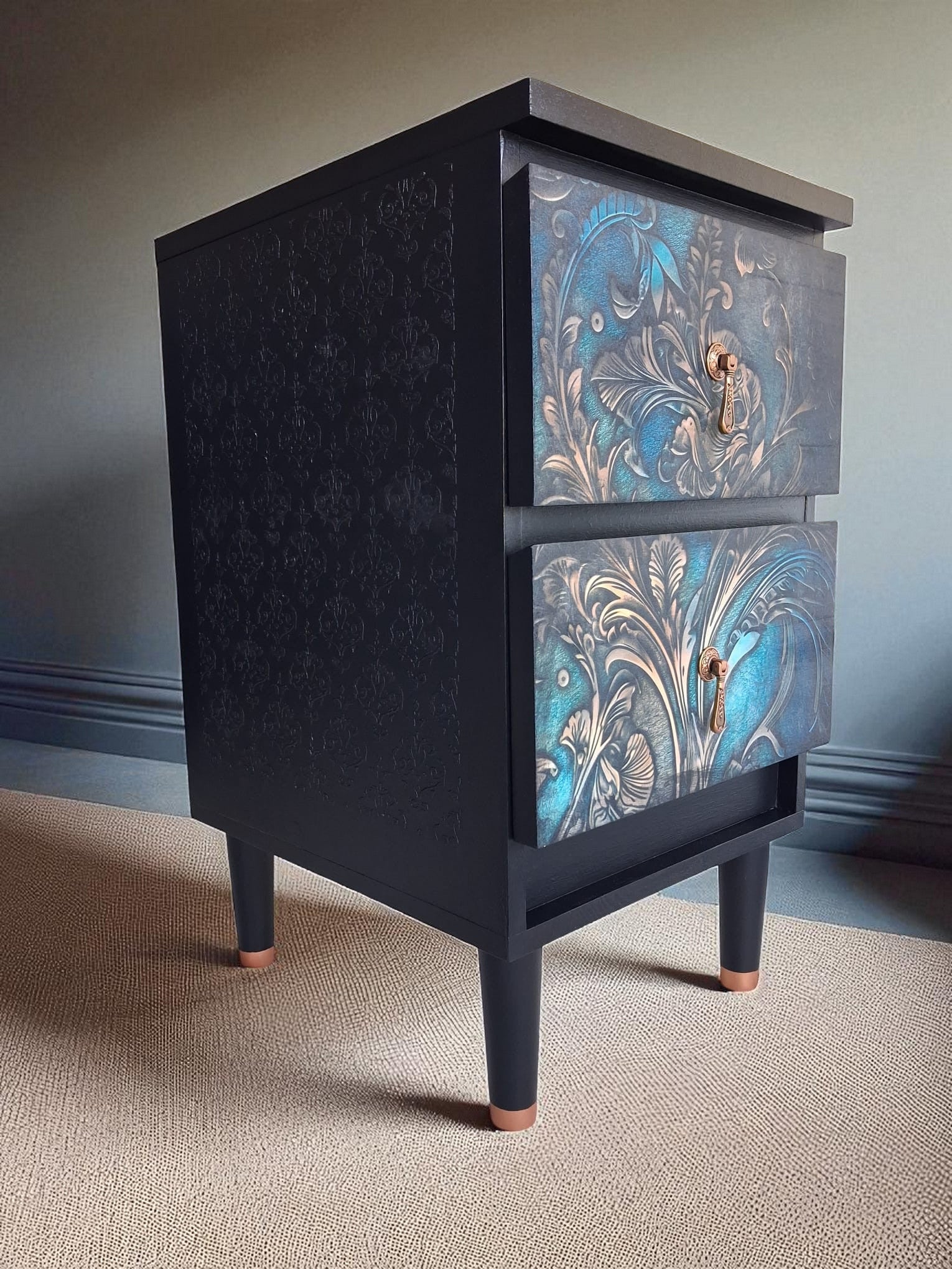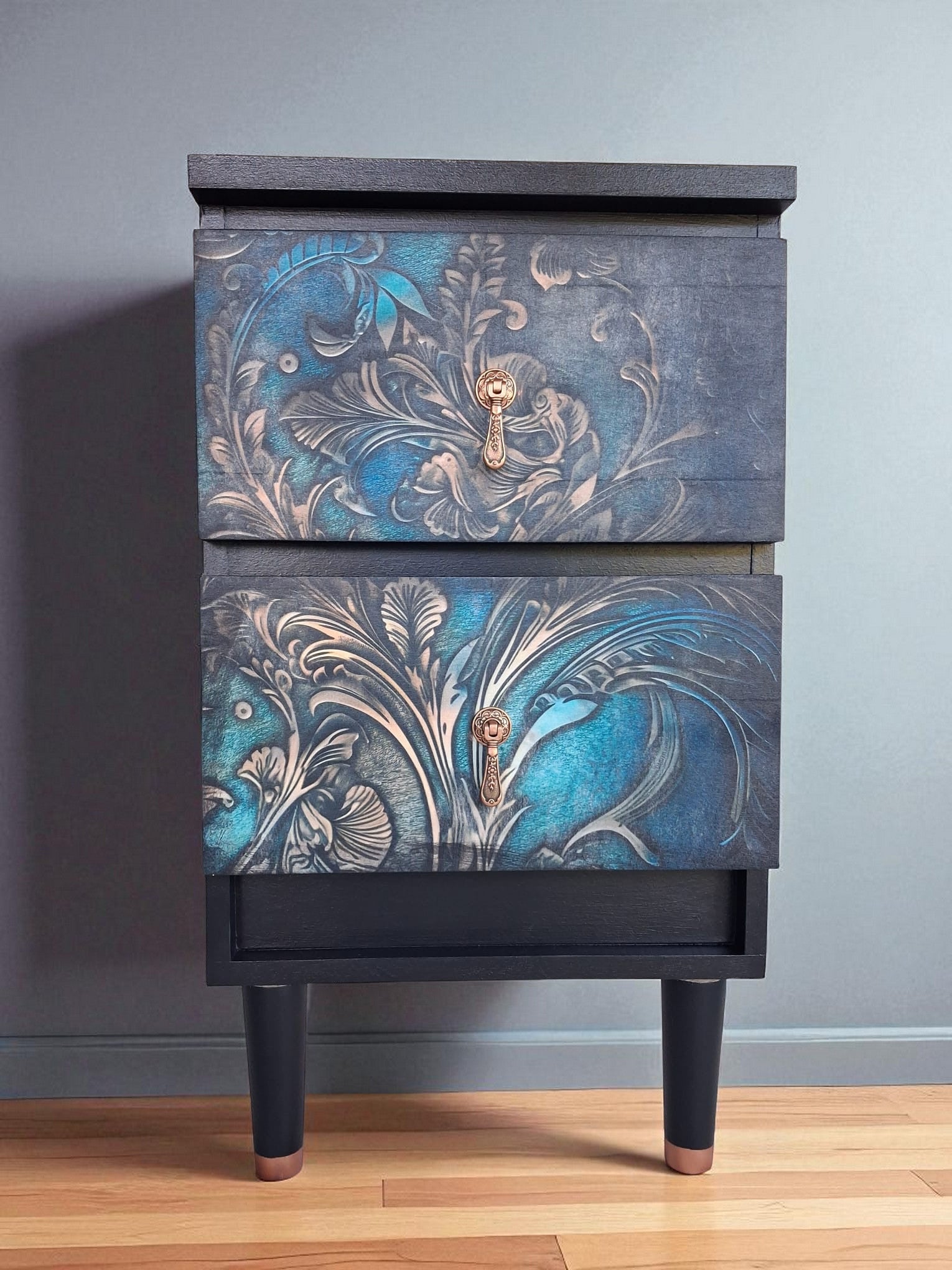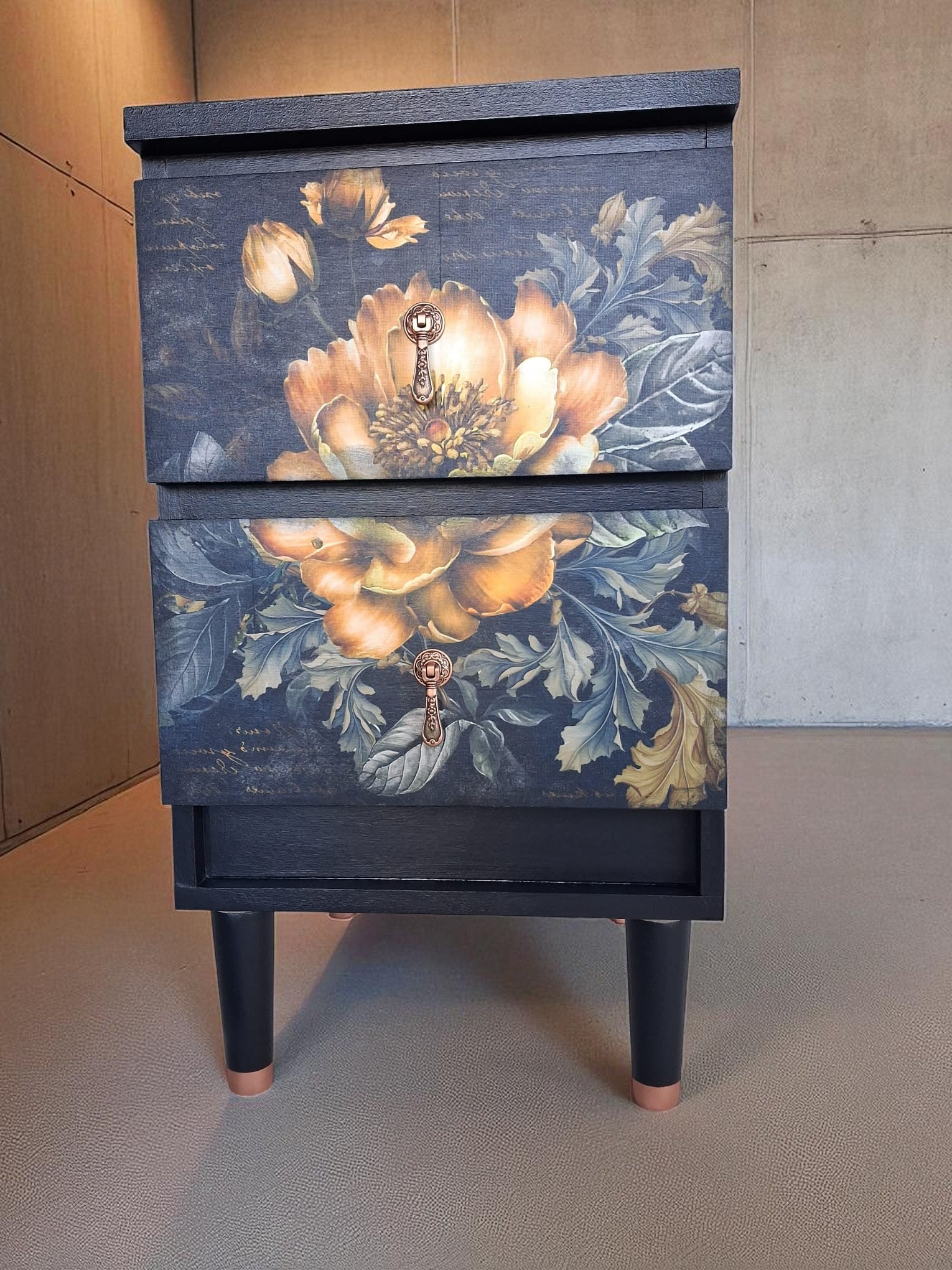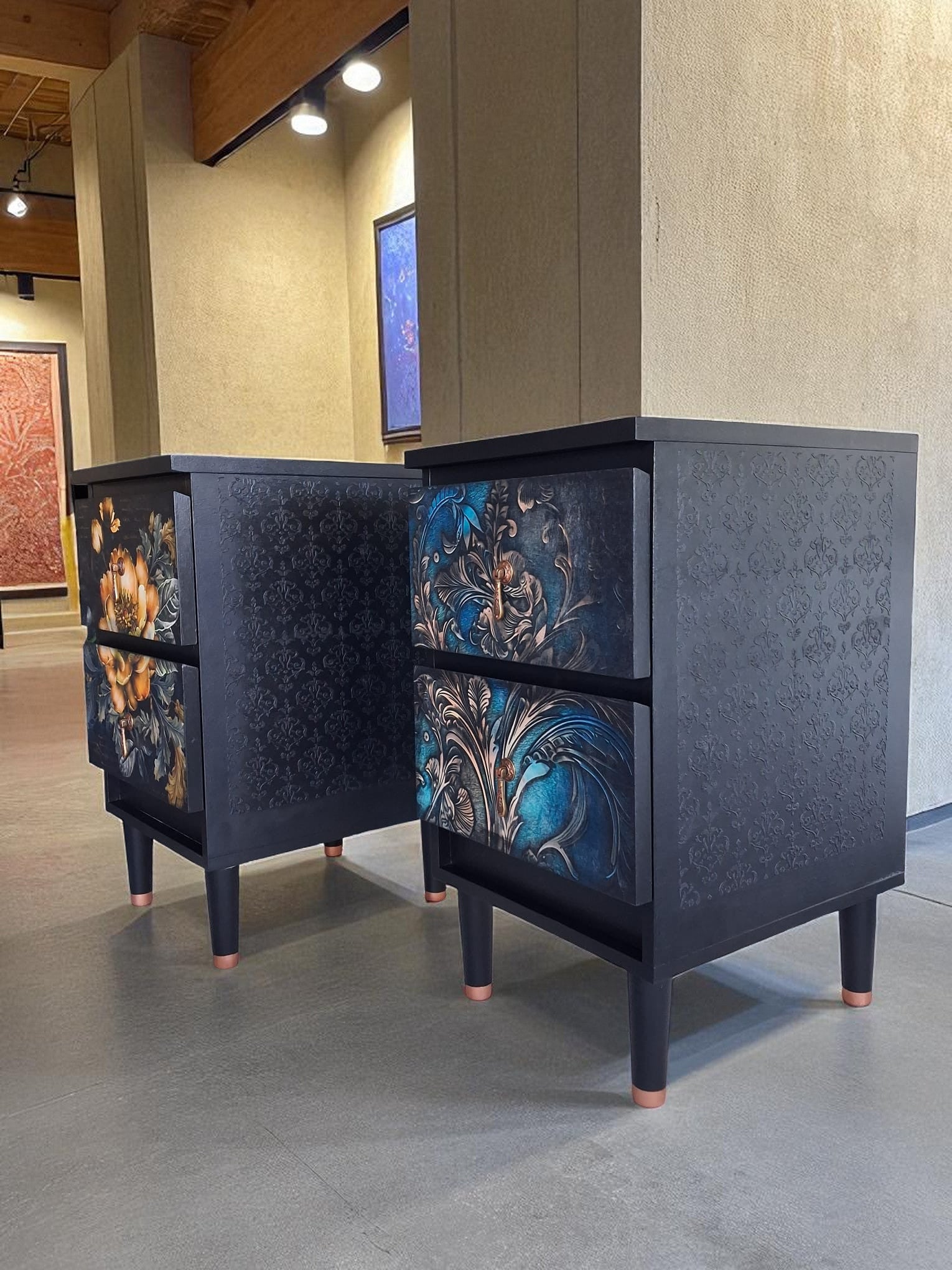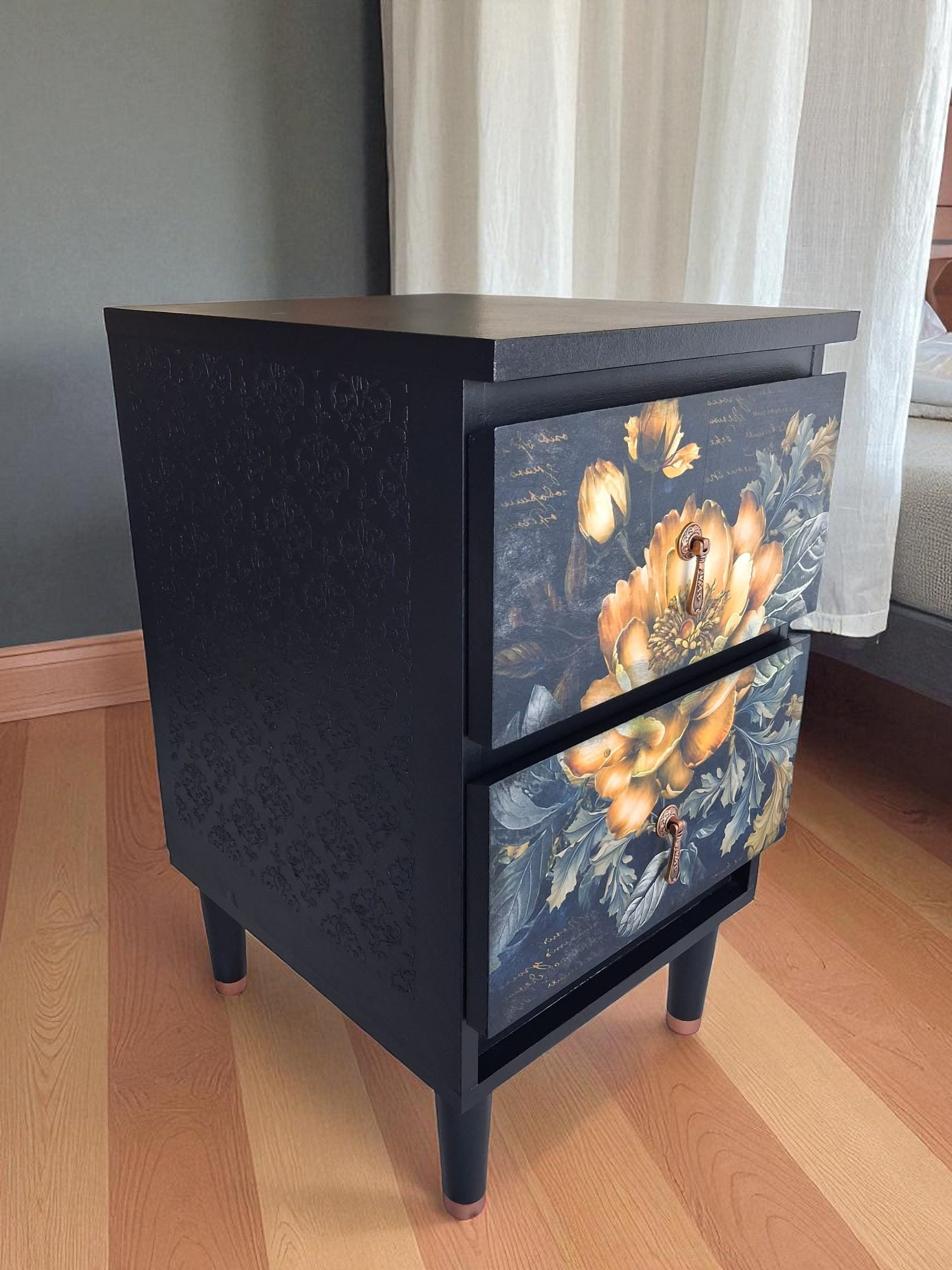Pintadas a mano en negro mate con elegantes frentes en decoupage floral, detalles en esténcil damasco en los laterales y patas estilizadas con puntas en color cobre. Acabadas con tiradores dorados vintage que aportan un toque artístico y atemporal.