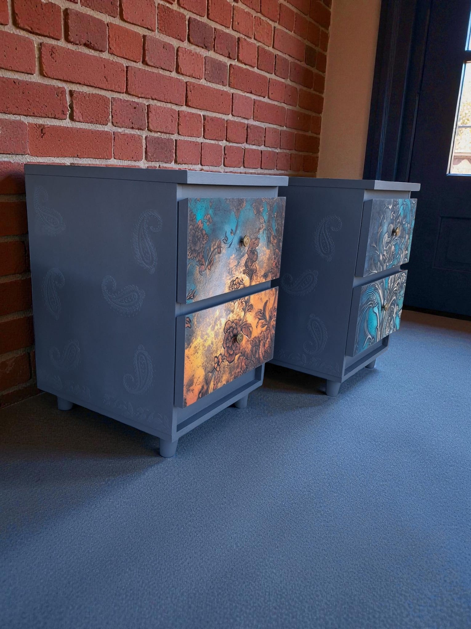 Pintadas a mano en color pizarra azulado con elegantes frentes en decoupage floral, detalles en esténcil damasco en los laterales y patas estilo nórdico. Acabadas con tiradores dorados vintage que aportan un toque artístico y atemporal.